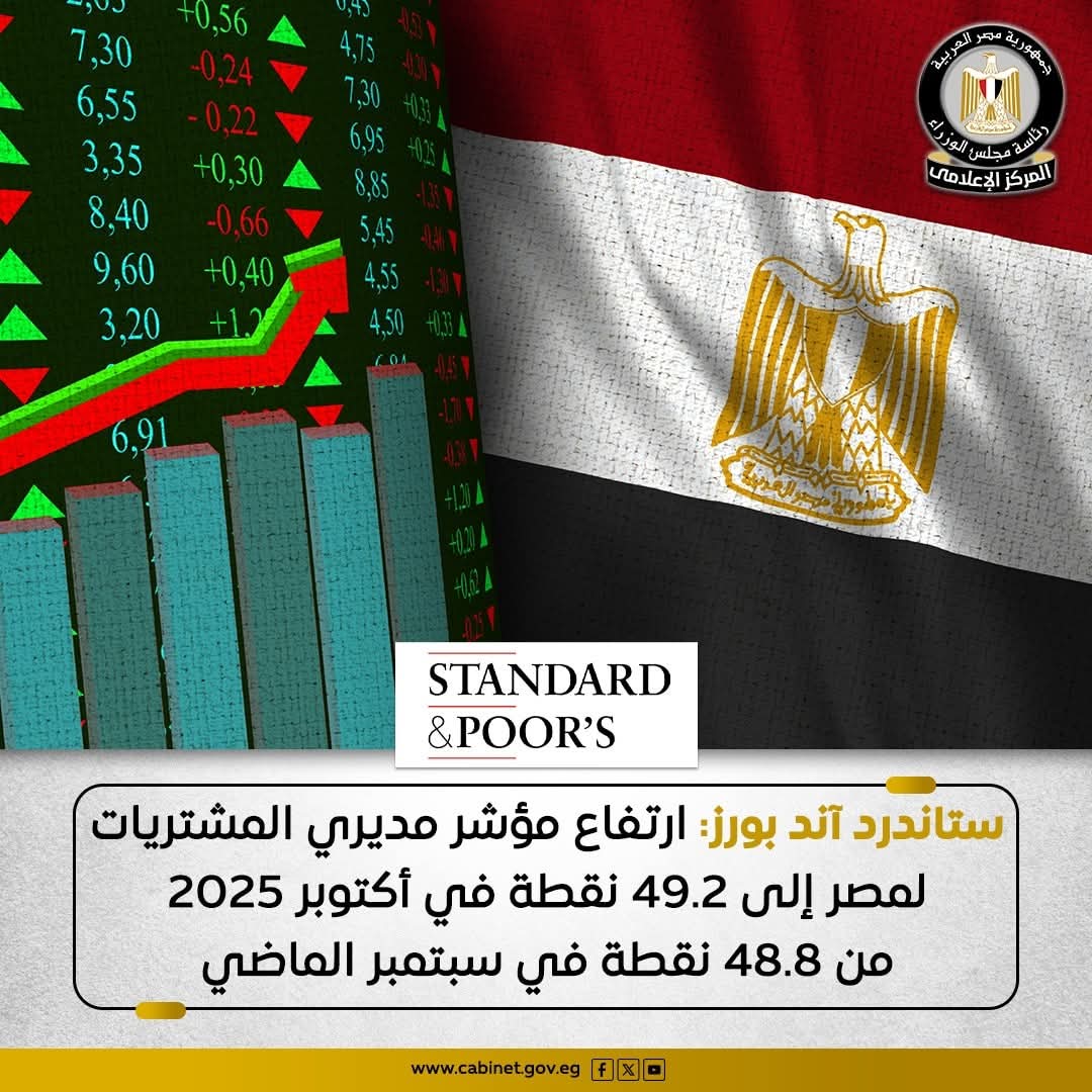 تحسن مؤشر مديري المشتريات لمصر في أكتوبر 2025 بعدما سجل 49.2 نقطة وفقًا لتقرير "ستاندرد آند بورز"، ليظل أعلى من متوسط السلسلة البالغ 48.2 نقطة.