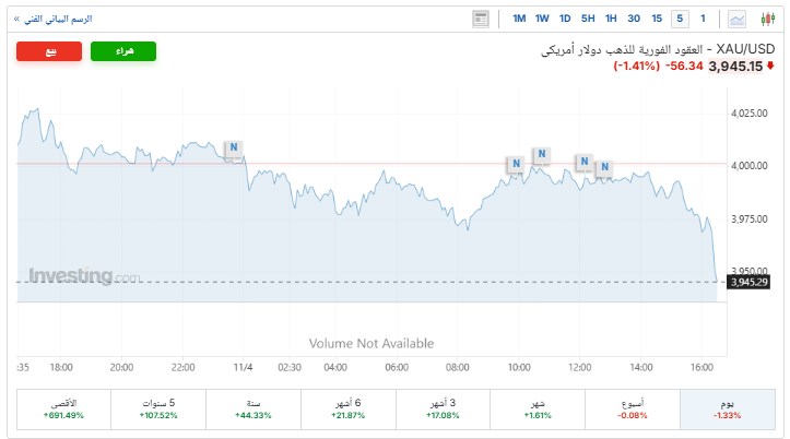 كما تراجعت الأسعار الفورية للذهب بنسبة 1.3% لتتداول حاليًا عند 3945 دولارًا للأوقية، لتسجل أدنى مستوى لها اليوم، فيما سجلت أعلى مستوى عند 4005 دولارًا، بحسب تقرير موقع «إنفيستينج».