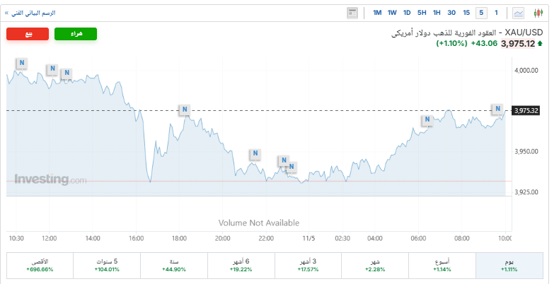 وارتفعت الأسعار الفورية للذهب بنسبة 1.1% لتتداول حاليًا عند 3975 دولارًا للأوقية، بعد أن سجلت أدنى مستوى عند 3930 دولارًا وأعلى مستوى عند 3,978 دولارًا، بحسب تقرير موقع «إنفيستينج».