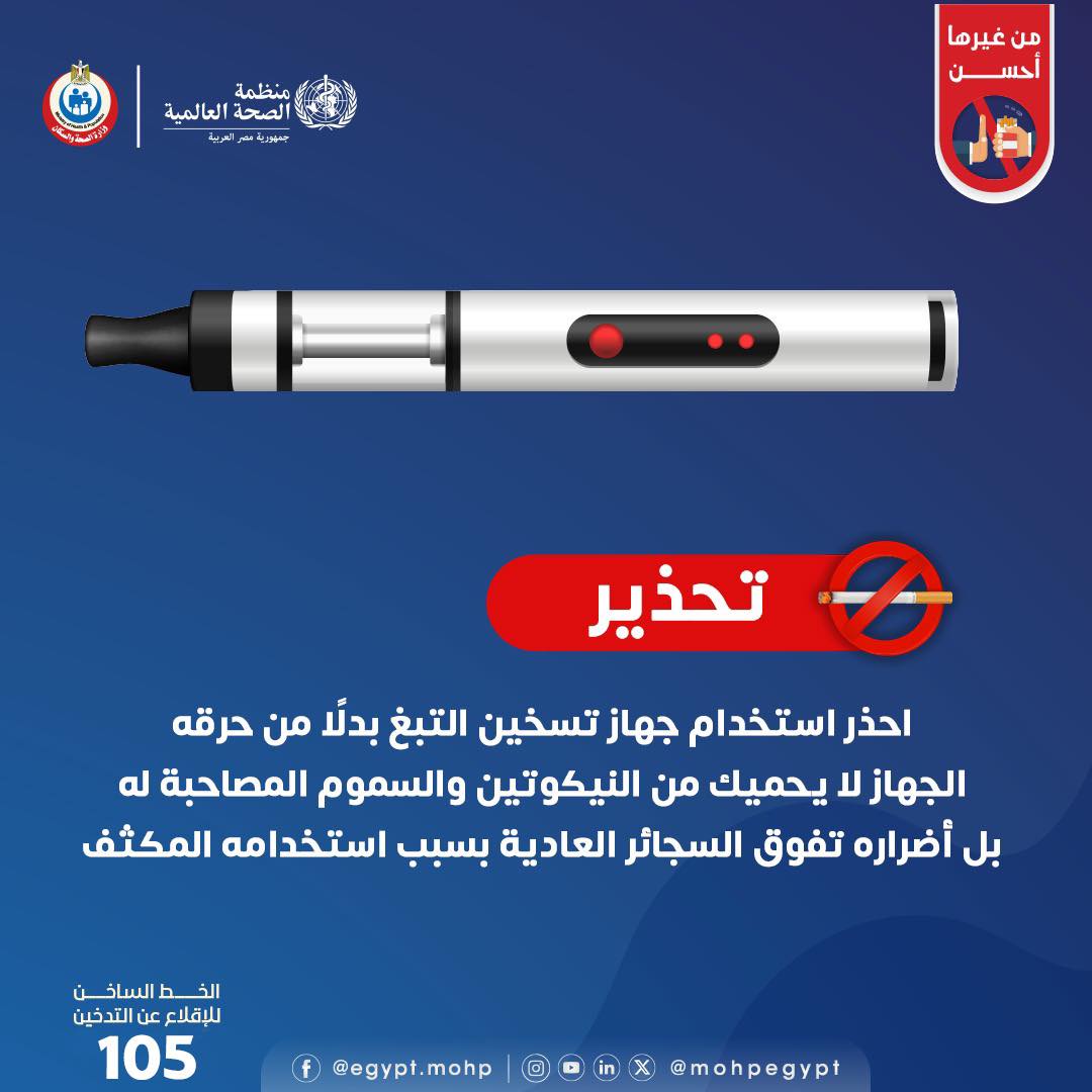 وأضافت الوزارة خلال صفحتها الرسمية على موقع التواصل الاجتماعي “فيسبوك”: “لا تستخدم جهاز تسخين التبغ بدلًا من حرقه لأنه لا يحميك من النيكوتين والسموم، بل أضراره تفوق السجائر العادية”.