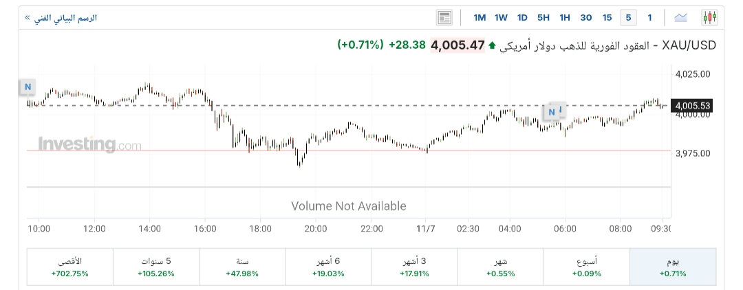 وسجلت عقود الذهب الآجلة تسليم ديسمبر ارتفاعًا بنسبة 0.5%، لتسجل نحو 4,010.80 دولارًا للأوقية، بعدما افتتحت تداولات اليوم عند المستوى 3,986.90 دولارًا للأوقية، وفقًا لـ«ياهو فايننس».