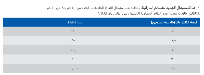يمكن استبدال النقاط للحصول على مبلغ نقدي (كاش باك) وفق القيم التالية: