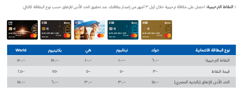 - بطاقة تيتانيوم: 100 ألف نقطة مع حد أدنى للإنفاق 30 ألف جنيه مصري.