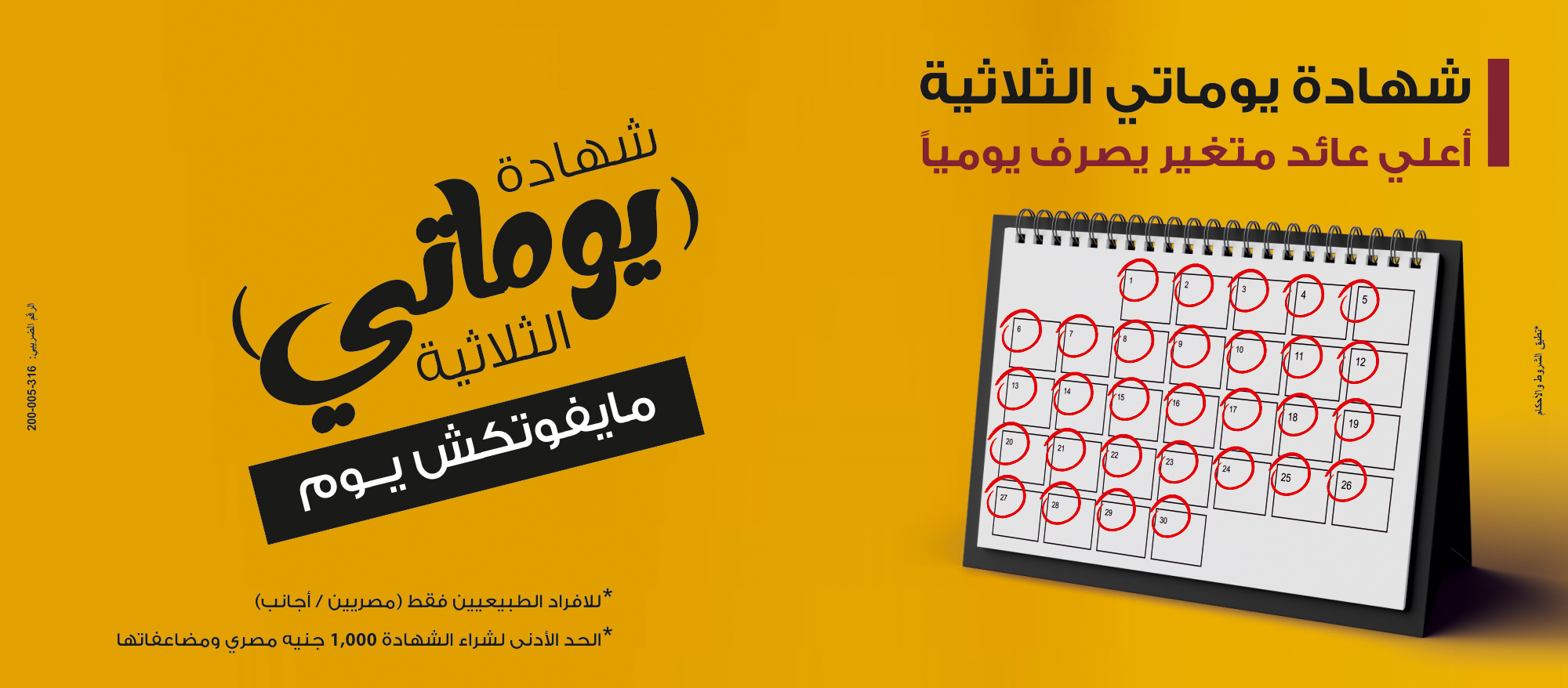 يتيح بنك مصر شهادة «يوماتي» بعائد يومي 20.75%، ما يمنح العملاء سيولة مستمرة، وعائد سنوي متغير ويصرف يوميًا، (سعر الكوريدور إيداع - 0.25%).