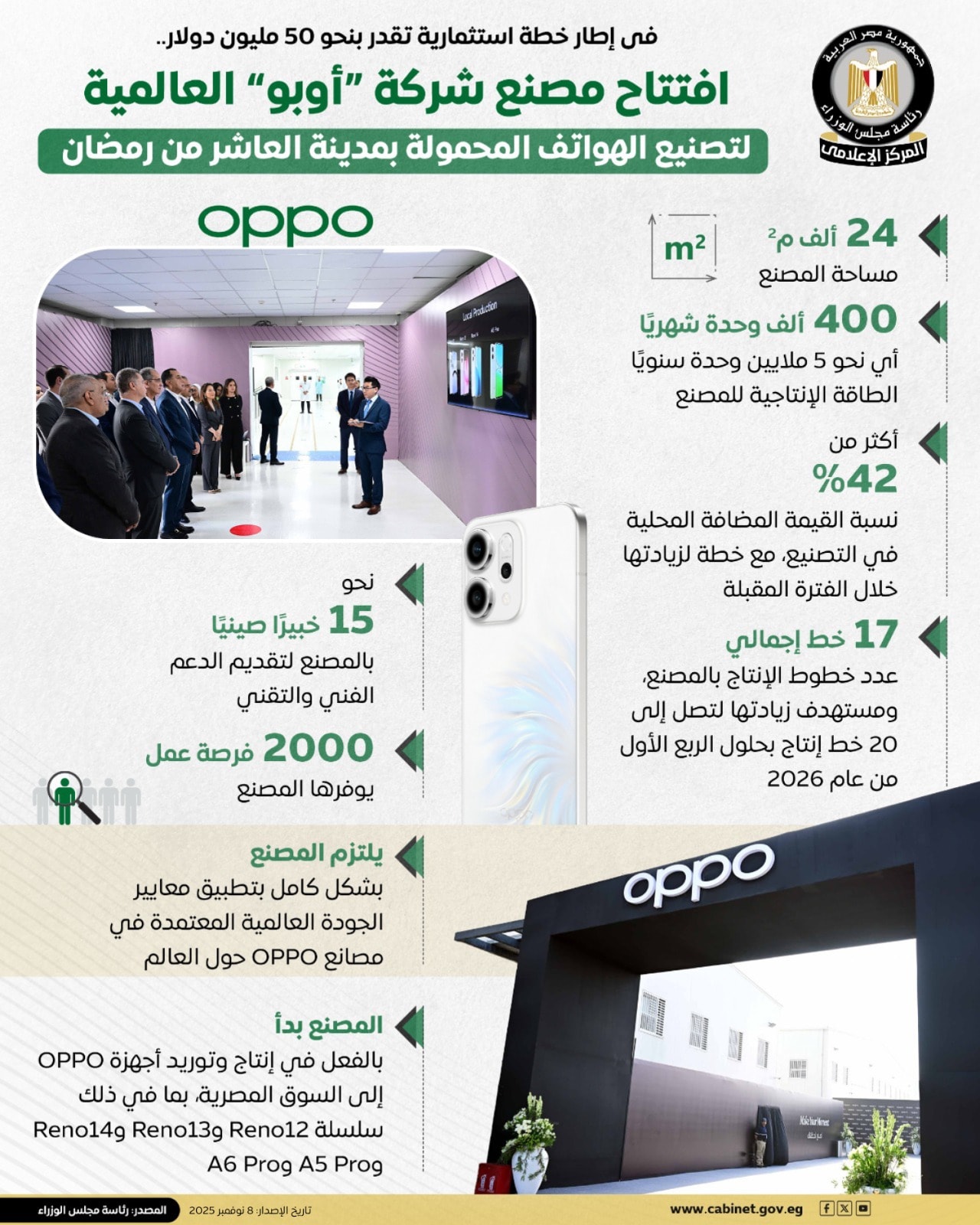 50 مليون دولار، تفاصيل افتتاح مصنع «OPPO» بالعاشر من رمضان (إنفوجراف)