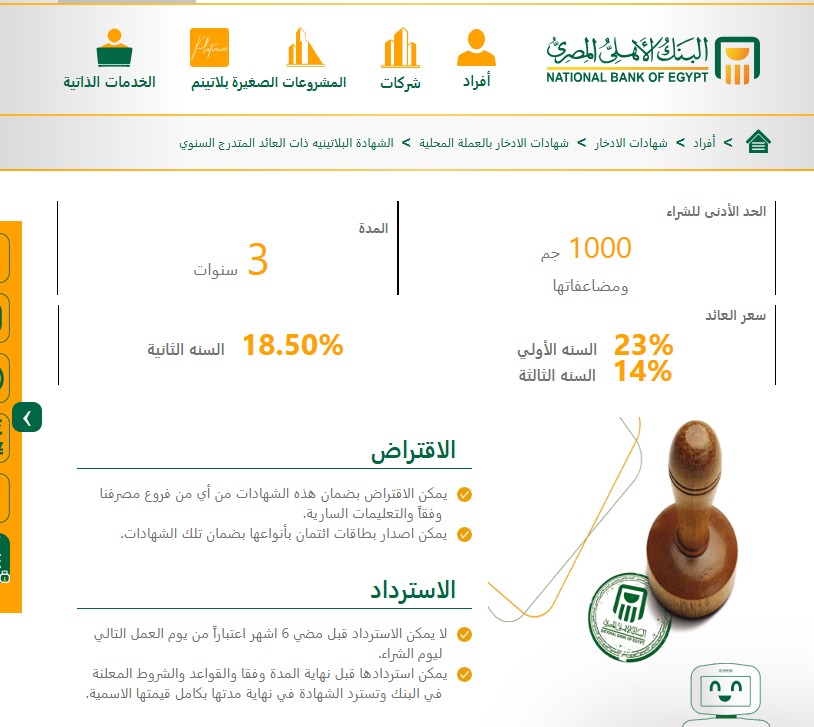 يصل الحد الأدنى للشراء إلى 1,000 جنيه ومضاعفاتها، ولمدة 3 سنوات، وسعر العائد حاليًا في السنة الأولي، يصل إلى 23% وفي السنة الثانية 18.50% وفي السنة الثالثة 14%، ويُحسب العائد سنويًا طوال المدة، بدءًا من اليوم العمل التالي للشراء مباشرة، كما يمكن للعملاء الاقتراض بضمان هذه الشهادات من أي فرع من فروع البنك، وفقًا للتعليمات السارية، إضافة إلى إصدار بطاقات ائتمان متنوعة، بضمان تلك الشهادات.