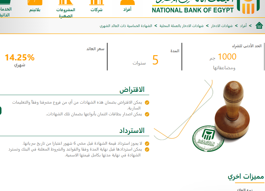 ويتيح البنك للجهات شراء الشهادة لصالح الافراد العاملين بها على أن لا يمكن الاسترداد خلال مده 6 سنوات من تاريخ الشراء .