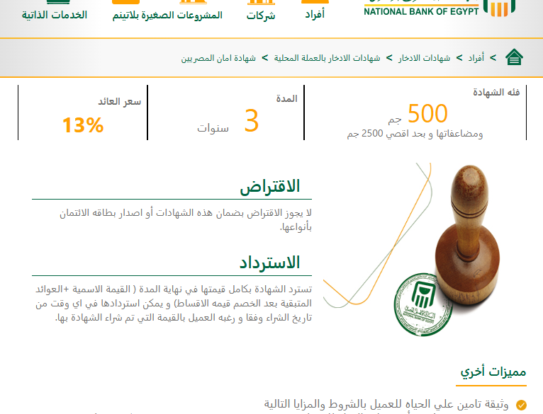 يوفر البنك الأهلي المصري شهادة أمان المصريين بعائد 13%، وتصل فئه الشهادة إلى 500 جنيه ومضاعفاتها و بحد أقصي 2500 جنيه، لمدة 3 سنوات، لا يجوز الاقتراض بضمان هذه الشهادات أو اصدار بطاقه الائتمان بأنواعها.