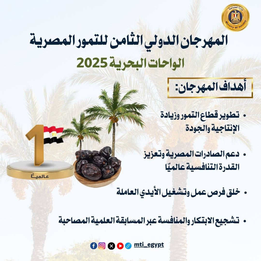 يعد قطاع إنتاج وتصنيع التمور في مصر، أحد القطاعات الواعدة لتحقيق النمو الاقتصادي وزيادة الصادرات، حيث يخلق فرص العمل ويساعد في تشغيل الأيدي العاملة، ويمثل المهرجان الدولي للتمور، خطوة مهمة لدعم وتطوير قطاع التمور، ورفع قدرته التنافسية دوليًا، بما يسهم في تعزيز الصادرات المصرية، وتوفير المزيد من فرص العمل، ما يهدف إلى تحقيق انطلاقة قوية للاقتصاد المصري، ويضع مصر في مكانتها المستحقة عالميًا.