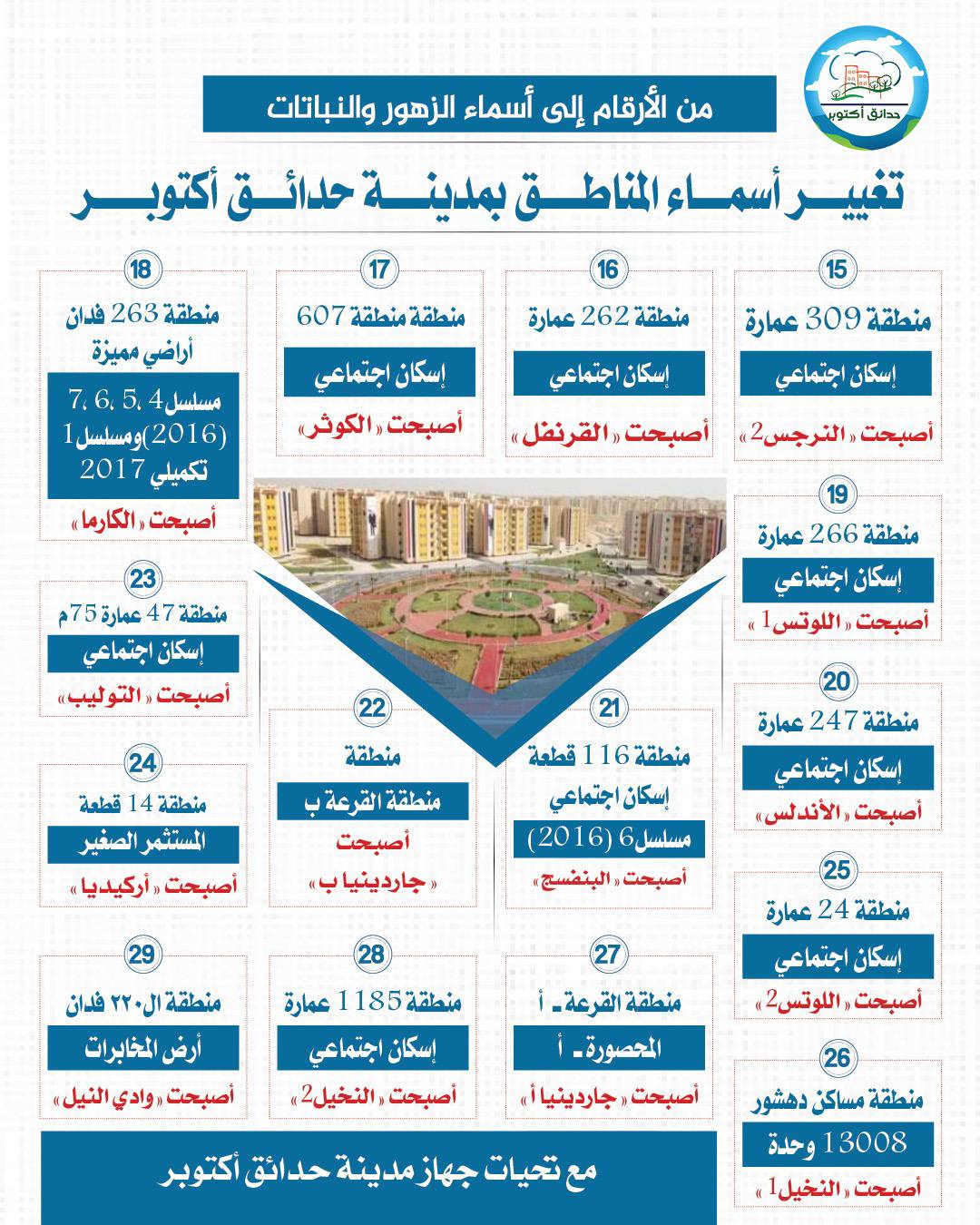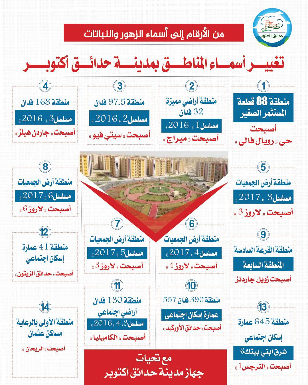 أعلن جهاز مدينة حدائق أكتوبر، عن اعتماد هيئة المجتمعات العمرانية للأسماء الجديدة بديلة للأسماء الرقمية بالمدينة، بعد طلب المهندس محمد عبد الله رئيس جهاز المدينة بتغيير أسماء الأرقام استجابة إلى مناشدة المواطنين الساكنين بالمدينة.