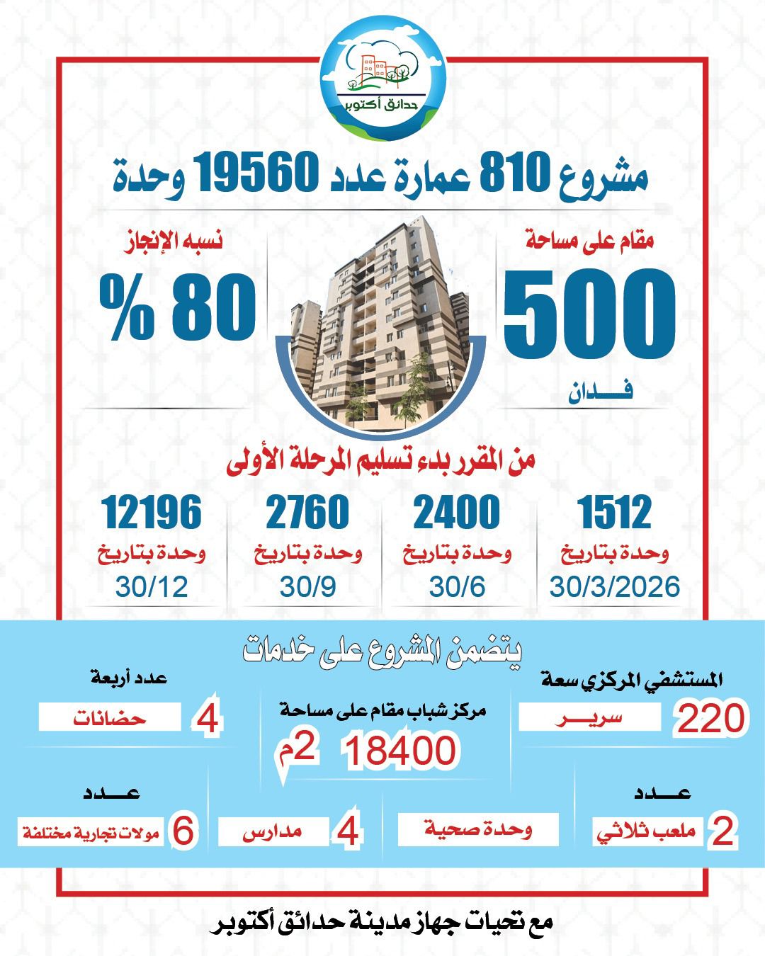 أعلن جهاز تنمية حدائق أكتوبر، تدشين مشروع سكني، وهو مشروع 810 عمارة بإجمالي عدد 19560 وحدة سكنية، حيث يقام المشروع على مساحة 500 فدان، بنسبة إنجاز %80، ومن المقرر بدء تسليم المرحلة الأولى 1512 وحدة بتاريخ 30/3/2026.