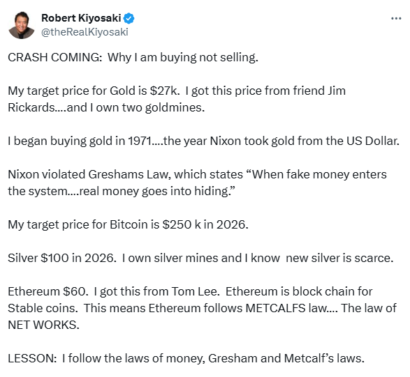وقال رجل الأعمال الأمريكي، أن الانهيار المالي قادم، ولهذا يشتري الأصول ولا يبيعها، مضيفًا أن السعر المستهدف للبيتكوين هو 250 ألف دولار، ولسعر الفضة 100 دولار عام 2026، وأنه يمتلك مناجم فضة ويعلم أن الفضة الجديدة نادرة.