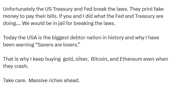 وأوضح أن الولايات المتحدة أصبحت أكبر دولة مدينة في التاريخ، محذرًا من أن المدخرين سيكونون الخاسرين في ظل تآكل القوة الشرائية للدولار، وبحسب تعبيره يستمر في شراء الذهب والفضة والبيتكوين والإيثريوم حتى في فترات التراجع.