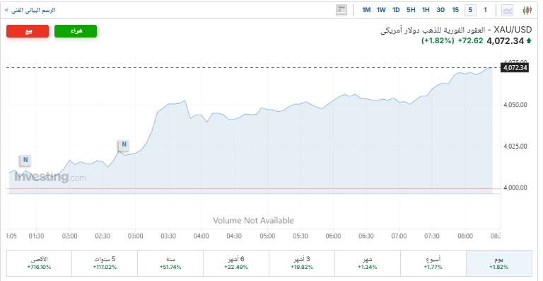 أما على الصعيد العالمي، فقد ارتفع سعر أونصة الذهب العالمي في جلسة بداية الأسبوع، بنسبة 1.8% لتعوض خسائر الأسبوع الماضي، مسجلة الآن 4,072 دولار للأوقية، بعد أن حققت خسارة أسبوعية طفيفة خلال الأسبوع الماضي بنسبة 0.06%، وفقاً لـ «انفستينج».