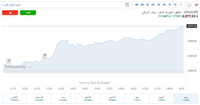 وارتفعت الأسعار الفورية للذهب بنسبة 1.9% لتتداول حاليًا عند 4077 دولارًا للأوقية، بعد أن سجلت أدنى مستوى عند 3999 دولارًا وأعلى مستوى عند 4077 دولارًا، بحسب تقرير موقع «إنفيستينج».