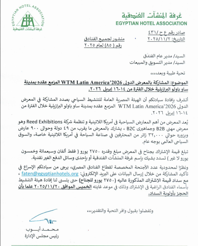 وحصل موقع "إيجي إن" على منشور الهيئة رقم 85 لعام 2025، والذي أوضح أن المعرض يُعد من أبرز المعارض السياحية في أمريكا اللاتينية، وينظمه شركة REED Exhibition. ويشارك فيه نحو 49 دولة وحوالي 900 عارض، ويستقبل المعرض حوالي 32 ألف زائر من المحترفين في صناعة السياحة في أمريكا اللاتينية والعالم.