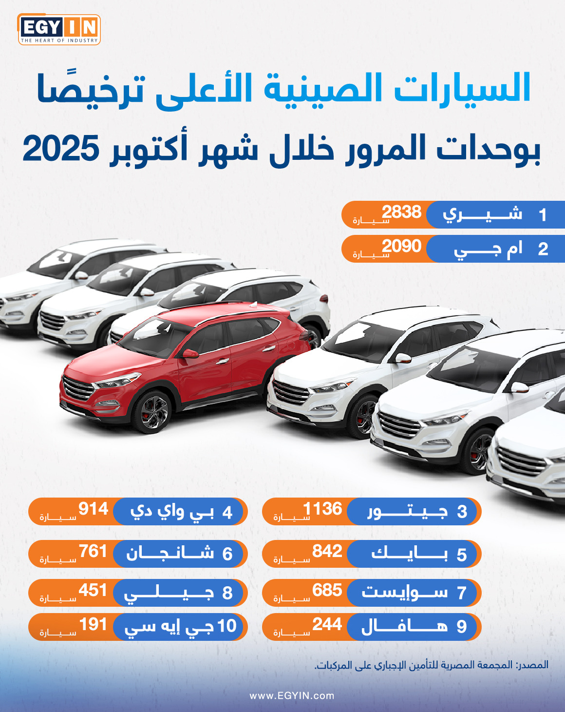السيارات الصينية الأعلى ترخيصًا خلال أكتوبر 2025 (إنفوجراف)