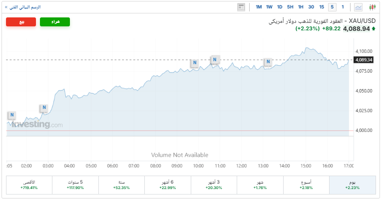 أما على الصعيد العالمي، ارتفع سعر أونصة الذهب العالمي منذ افتتاح جلسة بداية الأسبوع بحوالي 2.2% بما يعادل 105دولارًا، لتتداول الآن عند 4,088 دولار للأوقية، بعد أن افتتحت التداولات عند 3999 دولار، مدفوعة بزيادة توقعات خفض الفيدرالي الأمريكي لأسعار الفائدة، وفقًا لـ «انفستينج».