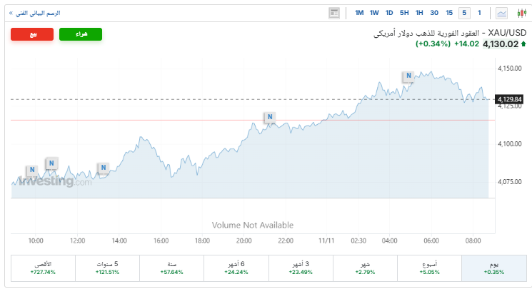وارتفعت الأسعار الفورية للذهب بنسبة 0.3% لتتداول حاليًا عند 4130 دولارًا للأوقية، بعد أن سجلت أدنى مستوى عند 4,115 دولارًا وأعلى مستوى عند 4,148 دولارًا، بحسب تقرير موقع «إنفيستينج».