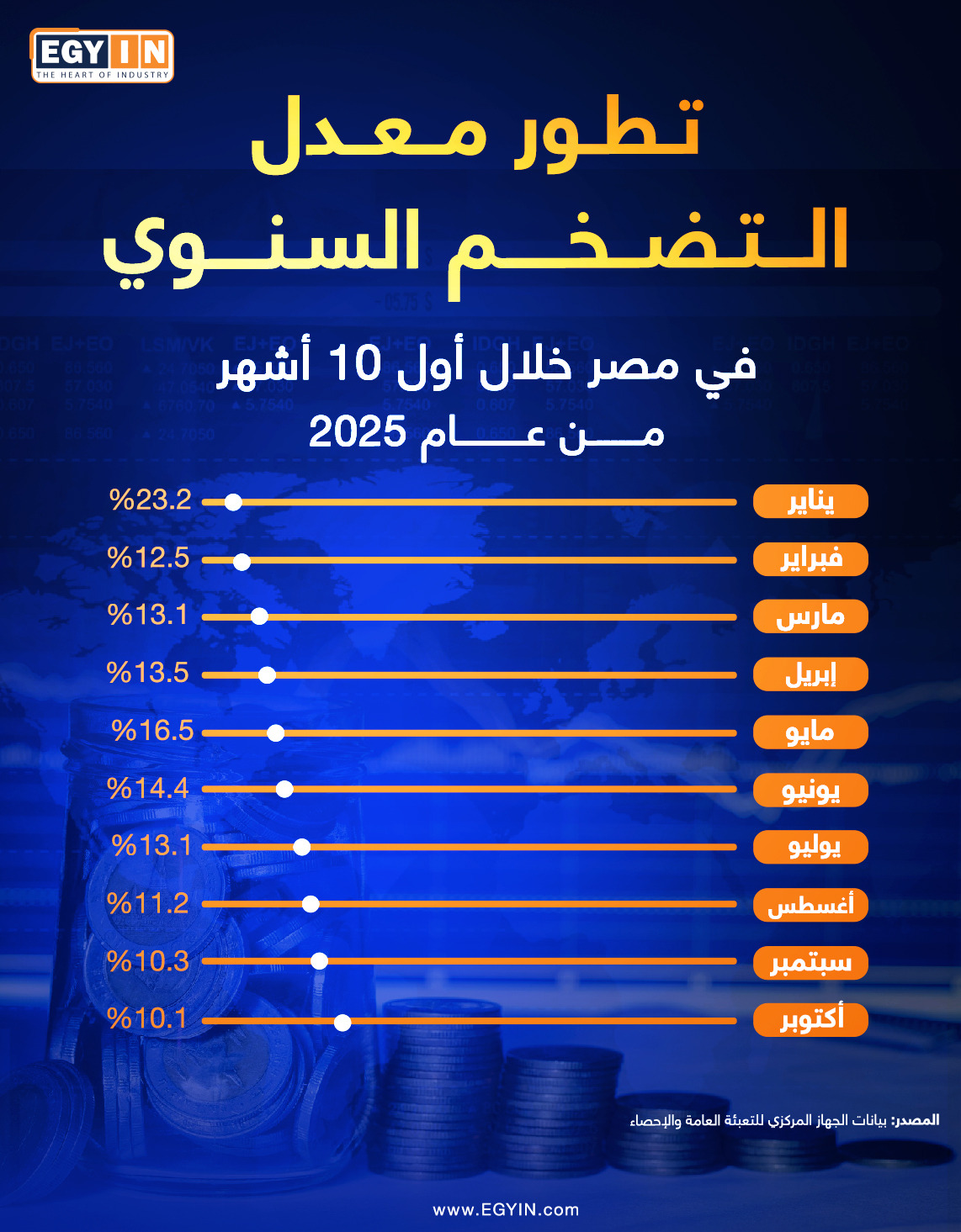 سجل معدل التضخم السنوي في مصر، تراجعًا ملحوظًا خلال شهر أكتوبر 2025، ليصل إلى 10.1%، مقابل 10.3% في سبتمبر، و23.2% في يناير من العام نفسه، وفقًا لأحدث بيانات وردت عن الجهاز المركزي للتعبئة العامة والإحصاء.
