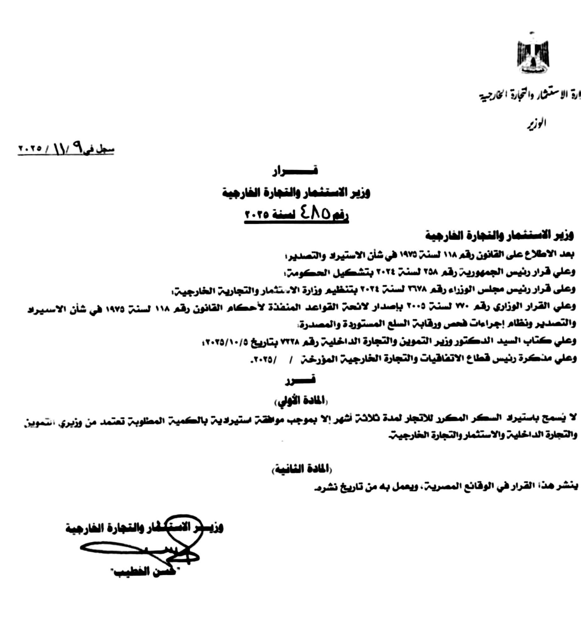 أصدر وزير الاستثمار والتجارة الخارجية، القرار رقم 485 لسنة 2025، الذي ينص على تنظيم استيراد السكر المكرر للاتجار في السوق المحلية.