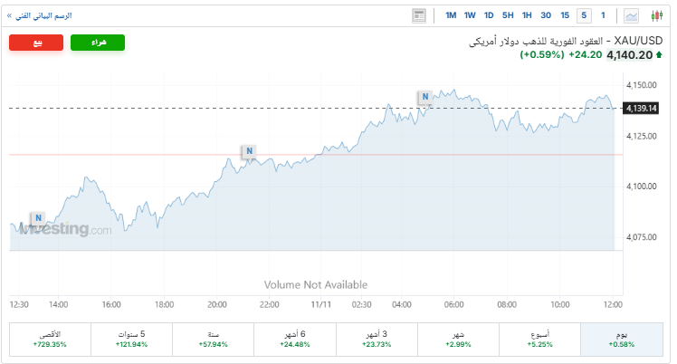 وسجلت عقود الذهب الآجلة تسليم ديسمبر ارتفاعًا بنسبة 0.6%، لتسجل نحو 4,150 دولارًا للأوقية، بعدما افتتحت تداولات اليوم عند المستوى 4,124 دولارًا للأوقية لترتفع بحوالي 26 دولارًا، وفقًا لـ«ياهو فايننس».
