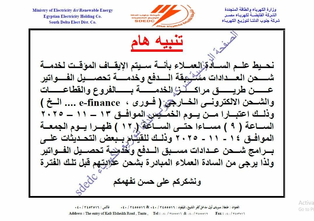 أعلنت شركة جنوب الدلتا لتوزيع الكهرباء، حدوث توقف مؤقت لخدمات شحن العدادات مسبقة الدفع وتحصيل الفواتير، وذلك في إطار أعمال تطوير وتحديث أنظمة الشحن والتحصيل الإلكتروني.