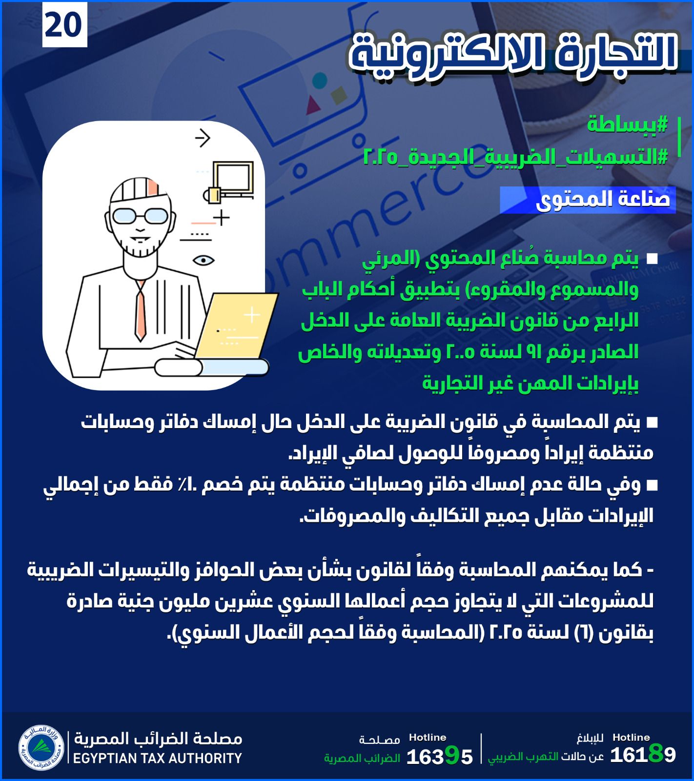 أعلنت مصلحة الضرائب المصرية، ضوابط جديدة لمحاسبة صناع المحتوى ضمن حزمة التسهيلات الضريبية الجديدة، إذ يتم محاسبة صُناع المحتوي (المرئي والمسموع والمقروء) بتطبيق أحكام الباب الرابع من قانون الضريبة العامة على الدخل الصادر برقم 91 لسنة 2005 وتعديلاته والخاص بإيرادات المهن غير التجارية.