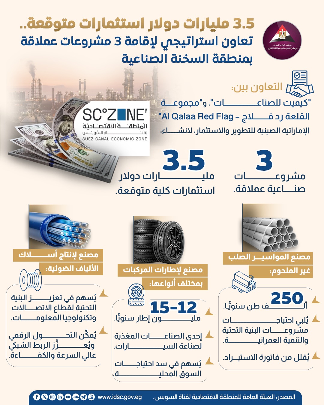 سلط مركز المعلومات ودعم اتخاذ القرار الضوء على مذكرة التفاهم بين مجموعة "كيميت للصناعات" ومجموعة "القلعة رد فلاج – Al Qalaa Red Flag" الإماراتية الصينية للتطوير والاستثمار، لإنشاء 3 مشروعات صناعية عملاقة بمنطقة السخنة الصناعية.