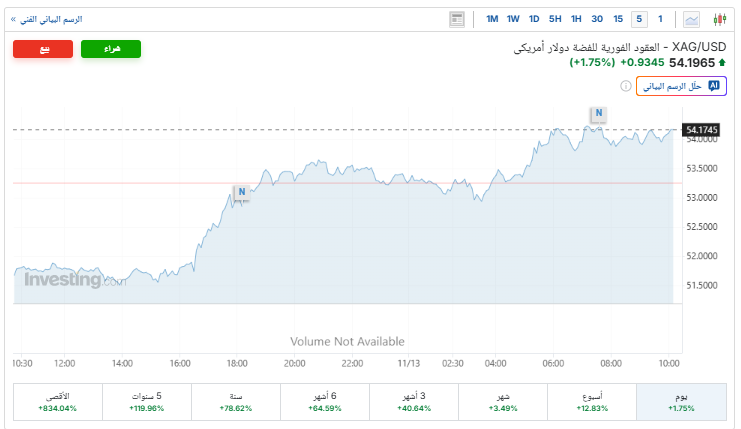 أما على الصعيد العالمي، افتتحت العقود الفورية للفضة تداولات اليوم على ارتفاع بنسبة 1.7%، لتتداول الآن عند المستوى 54.19 دولار للأوقية، بعد أن افتتحت التداولات عند المستوى 52.89 دولار، وفقًا لـ«إنفستينج».