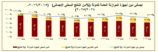 حقق إجمالي دين أجهزة الموازنة العامة نسبة إلى الناتج المحلى الإجمالي نحو 85,6% في يونيو 2025، وفقاً لأحدث البيانات التي أعلنتها وزارة المالية في التقرير المالي الشهري الصادر عن شهر أكتوبر 2025.
