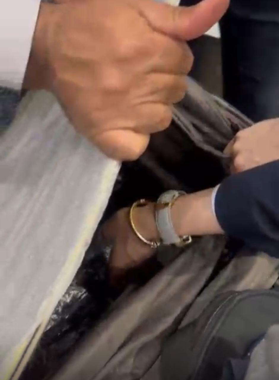 وبتكليف من محمد رمضان مكاوي، مدير إدارة الحركة والمشرف على صالة الوصول، قام كل من أحمد شعبان مأمور الجمرك، وخالد محمد عبدالرحمن رئيس القسم، بفحص الحقيبة على جهاز الأشعة، حيث ظهرت كثافات عضوية غير طبيعية، ثم تولت فاطمة محمد عبده، مأمور الجمرك، التفتيش اليدوي، ليُكتشف وجود قاع سحري بالحقيبة عبارة عن لوح خشبي مُغطى بطبقة فضية.