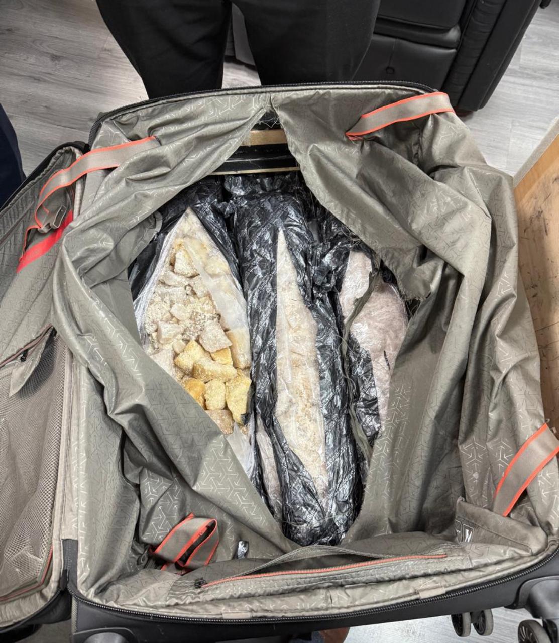 وبفض القاع المخفي عُثر على ثلاث لفافات مغلقة بكربون أسود وأسفلها غلاف شفاف يحوي قطعًا بلورية بأحجام مختلفة،وقام عمرو عبد المنعم، مدير الإدارة الأولى بالإنابة، بمعاينة المضبوطات وإبلاغ عبد العظيم حمادة مدير الإدارة الأولى، واشتبهت الإدارة في كون المضبوطات مواد مخدرة، ليتم تحرير محضر ضبط جمركي رقم 158 لسنة 2025، بعد العرض على الدكتور ماجد موسى، الذي وجّه بإبلاغ إدارة مكافحة المخدرات بالمطار لمتابعة اتصالات الراكب ومستقبليه، وكذلك التأكد من وجود شركاء آخرين معه.