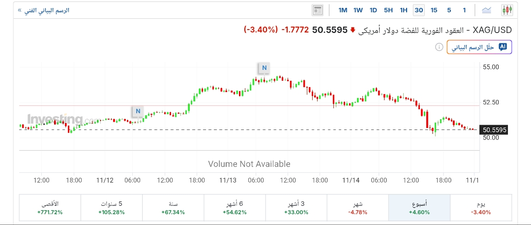 تراجع أسعار الفضة في بداية تعاملات اليوم السبت 15-11-2025
