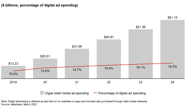 من المتوقع أن تبلغ قيمة وسائل الإعلام في قطاع التجزئة 61 مليار دولار بحلول عام 2024، أي ضعف أرقامها لعام 2021، وفي عام 2019، ذهب حوالي 50% من الإنفاق الإعلاني إلى الحملات الرقمية، وبحلول نهاية عام 2021، كان حوالي ثلثي الإعلانات في الولايات المتحدة رقمية.