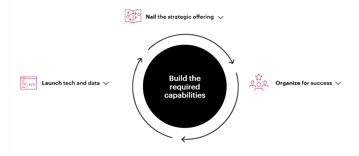 ويتم المساعدة على بناء نموذج أعمال ناجح لضمان تأييد كامل من القيادة، ثم، يتطلب مهارات مختلفة تمامًا، وتحدد بدقة متطلبات المواهب الجديدة وتساعد في وضع استراتيجية لتوظيف ودمج الفريق المناسب لتحقيق النتائج المرجوة.