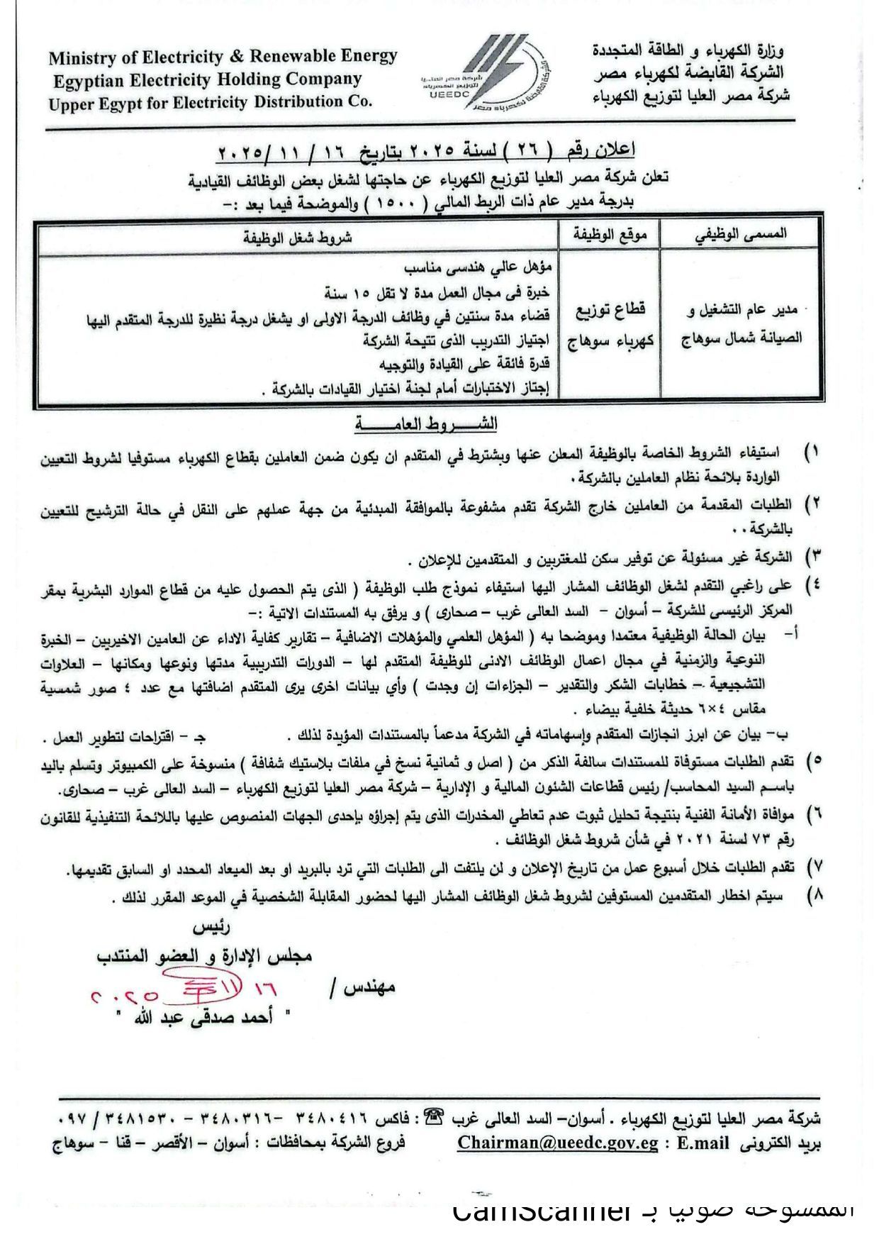 أعلنت شركة مصر العليا لتوزيع الكهرباء عن حاجتها  لشغل عدد من الوظائف القيادية بدرجة مدير عام وبربط مالي (1500 جنيه)، وذلك في إطار خططها لتعزيز الكفاءات داخل القطاعات التشغيلية.