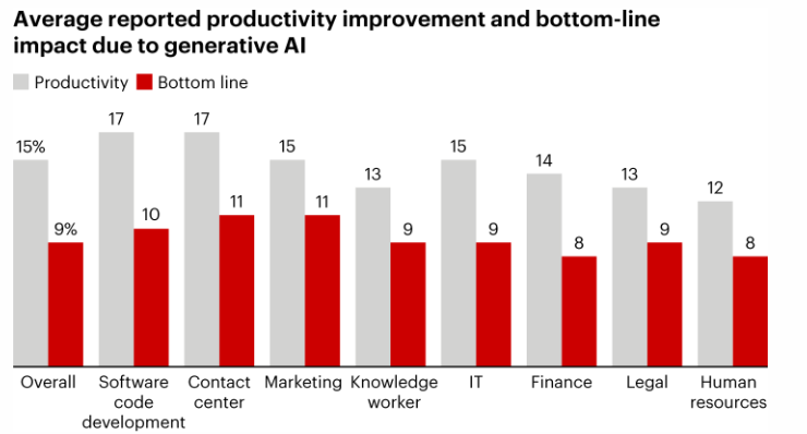 تظهر البيانات أن متوسط تحسن الإنتاجية بفضل الذكاء الاصطناعي التوليدي يبلغ نحو 15%، في حين يصل متوسط الأثر المباشر على صافي الأرباح إلى 9%.