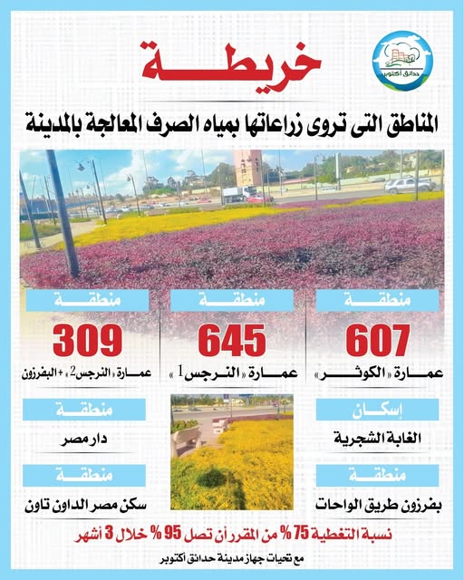 يأتي ذلك في الوقت الذي أعلن فيه جهاز مدينة حدائق أكتوبر، تغطية أكثر من 3.5 مليون متر مسطح زراعات، يتم ريها بمياه الصرف المعالجة بنسبة 75%، ومن المستهدف الوصول إلى نسبة 95% خلال 3 أشهر.