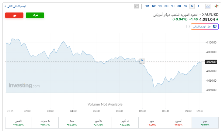 وسجلت عقود الذهب الآجلة تسليم ديسمبر تراجعاً بنسبة 0.4%، لتسجل نحو 4,075.20 دولارًا للأوقية، بعدما افتتحت تداولات اليوم عند المستوى 4,084.40 دولارًا للأوقية، وفقًا لـ«ياهو فايننس».