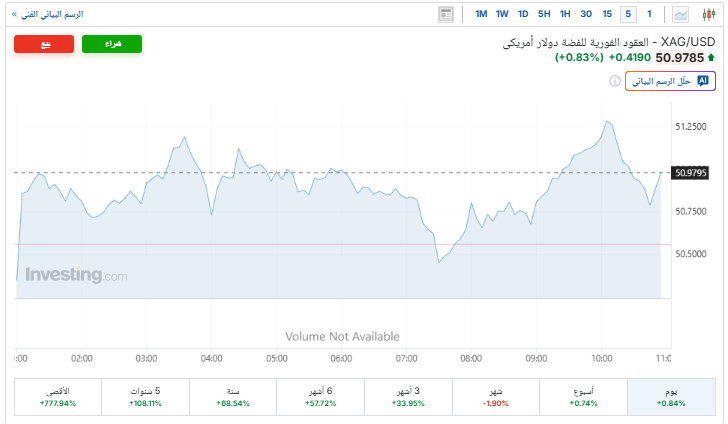 أما على الصعيد العالمي، ارتفعت العقود الفورية للفضة في جلسة بداية تداولات الأسبوع بنسبة 0.8%، مسجلة 50.97 دولار للأوقية، بعد أن حققت مكاسب أسبوعية بنسبة 4.8% خلال الأسبوع الماضي، وفقًا لـ«إنفستينج».