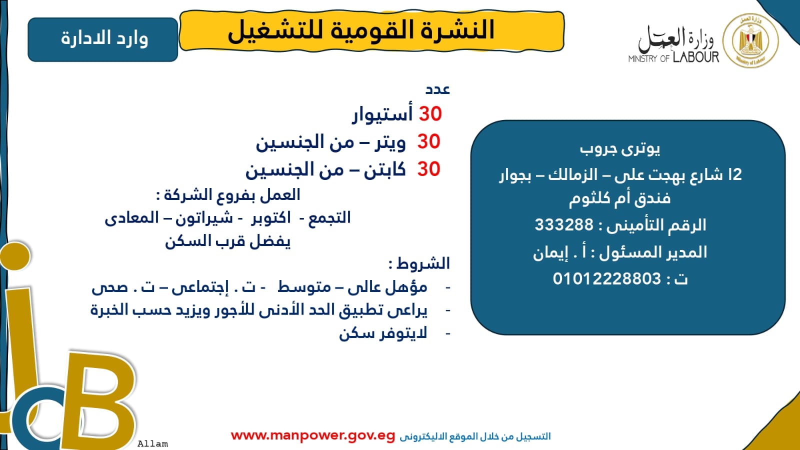 أصدرت وزارة العمل، اليوم الاثنين، نشرة التوظيف نصف الشهرية التي تتضمن فرص عمل جديدة متاحة في مختلف المحافظات، بالتعاون مع شركات القطاع الخاص، في إطار جهود الدولة المستمرة لتوفير فرص عمل لائقة للشباب، وتنفيذًا لتوجيهات القيادة السياسية بدمج مختلف فئات المجتمع في سوق العمل.