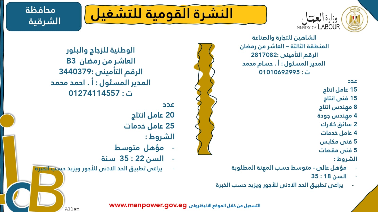 وتشمل النشرة الحالية فرصًا متاحة في 14 محافظة هي: القاهرة، الجيزة، المنوفية، السويس، الغربية، جنوب سيناء، سوهاج، أسيوط، بورسعيد، الإسماعيلية، الإسكندرية، المنيا، دمياط، والشرقية.