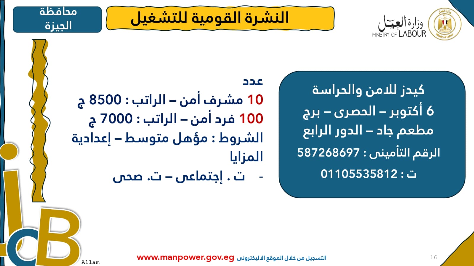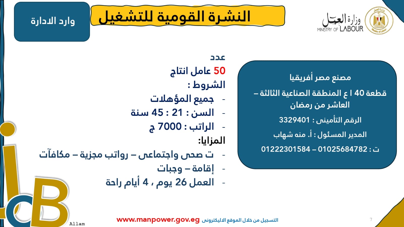 وأكدت الوزارة أن النشرة تتضمن مجموعة من الوظائف المخصصة لذوي الهمم، تنفيذًا لأحكام القانون رقم 10 لسنة 2018 بشأن حقوق الأشخاص ذوي الإعاقة، الذي يُلزم المنشآت بتخصيص نسبة 5% من إجمالي عمالها لهذه الفئة..