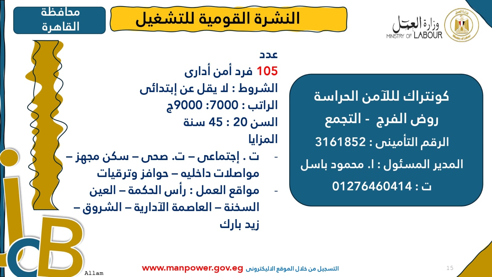 أوضحت الوزارة أن التقديم على هذه الفرص الجديدة يجرى خلال شهري نوفمبر وديسمبر 2025، عبر الإدارة العامة للتشغيل بمقر الوزارة القديم بمدينة نصر، أو من خلال مديريات العمل بالمحافظات، ويمكن التقديم مباشرة من خلال بيانات الشركات المرفقة بالنشرة، أو عبر الموقع الرسمي لوزارة العمل على شبكة الإنترنت.