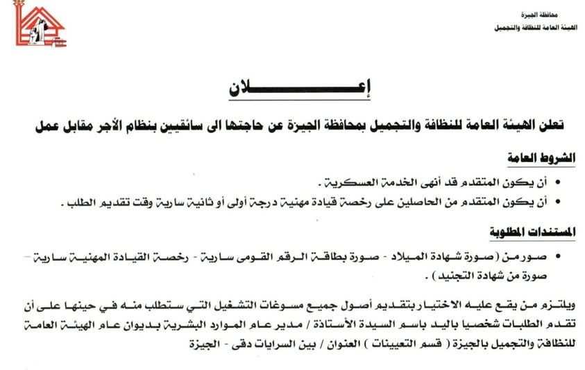 أعلنت الهيئة العامة للنظافة والتجميل بمحافظة الجيزة عن بدء تلقي طلبات التعيين لوظائف سائقين بنظام الأجر مقابل عمل، في إطار خطة الهيئة لتعزيز قوة العمل ورفع كفاءة خدمات النظافة بالمحافظة.