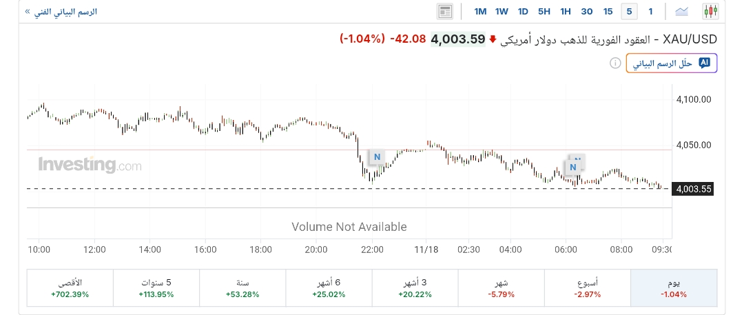انخفض الذهب للجلسة الرابعة على التوالي اليوم الثلاثاء 18 نوفمبر 2025، مواصلة خسائرها الأخيرة مع تراجع احتمالات خفض الفيدرالي الأمريكي أسعار الفائدة في ديسمبر المقبل، مما دعم الدولار وضغط على الأصول غير المدرة للعائد مثل الذهب والفضة.