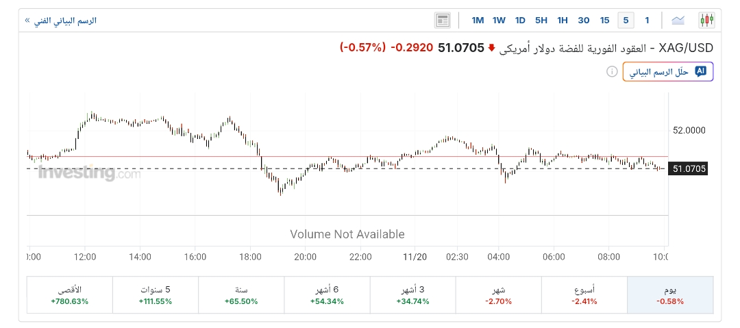 أما على الصعيد العالمي، تراجعت العقود الفورية للفضة في جلسة تداولات اليوم بنسبة 0.5%، مسجلة 51.07 دولار للأوقية، بعد أن افتتحت تداولات اليوم عند المستوى 51.36 دولار للأوقية، وفقًا لـ«إنفستينج».