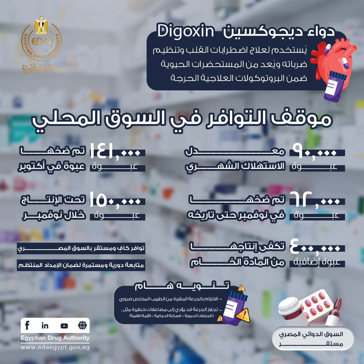 قالت هيئة الدواء المصرية إن دواء ديجوكسين (Digoxin) من المستحضرات الحيوية الهامة التي تُستخدم لعلاج أمراض القلب وتنظيم ضرباته، وهو ضمن البروتوكولات العلاجية الحرجة التي توليها الهيئة اهتمامًا خاصًا لضمان توافرها الدائم للمرضى.