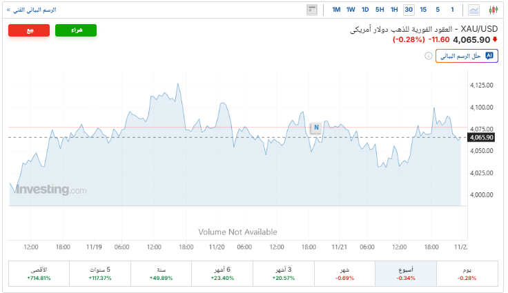 سجلت أسعار الذهب اليوم السبت 22 نوفمبر 2025 استقراراً ملحوظاً في سعر المعدن الأصفر، تزامناً مع العطلة الأسبوعية للبورصات العالمية، محققة خسارة أسبوعية بنسبة 0.3%، لتغلق التداولات عند المستوى 4065 دولارًا للأوقية، بعدما دعم تقرير أقوى من المتوقع للوظائف في الولايات المتحدة التوقعات بأن مجلس الاحتياطي الفيدرالي لن يخفض الفائدة في اجتماعه المقبل في شهر ديسمبر.